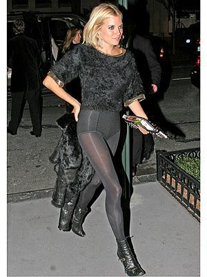 That doesn't look entirely terrible because the top looks like it is a very short dress. It doesn't really look like you are wearing tights and then a sweater over the top, it looks like a dress. This is how I perceive it.